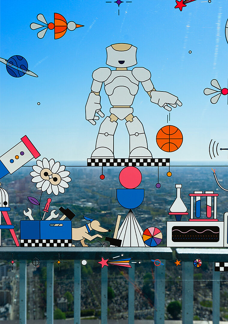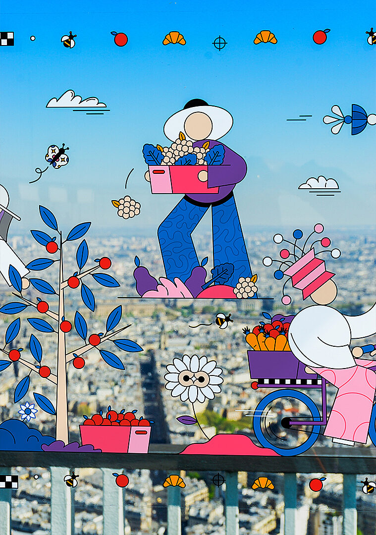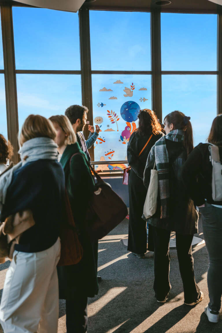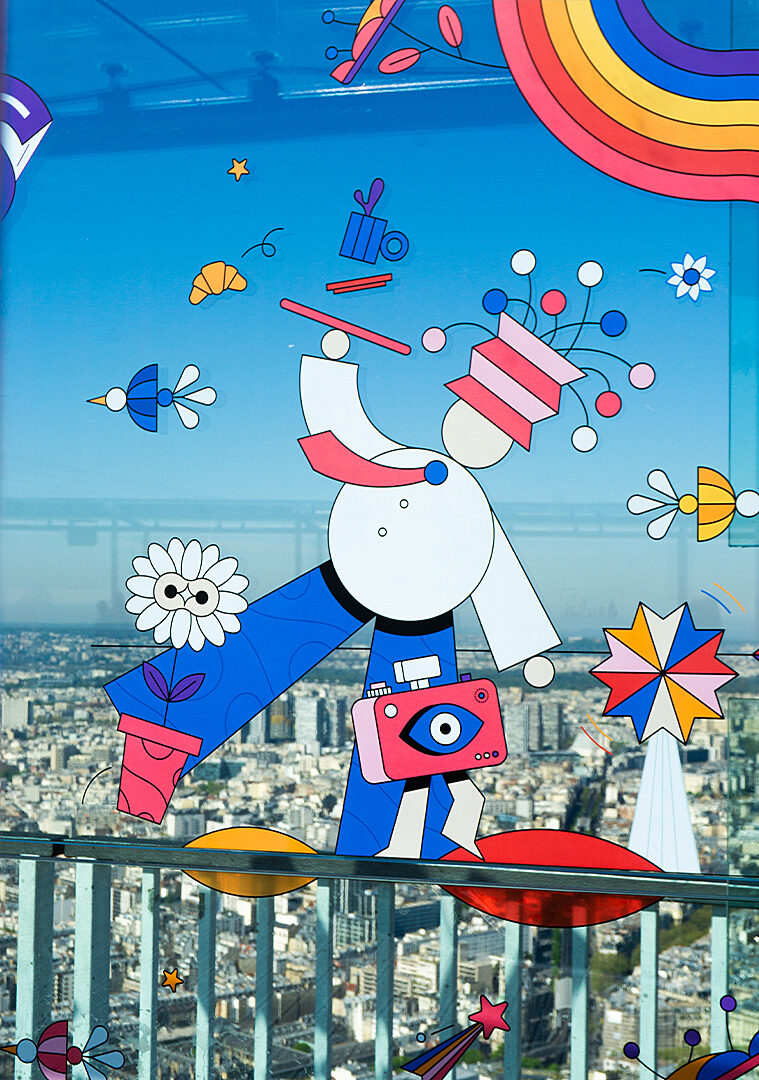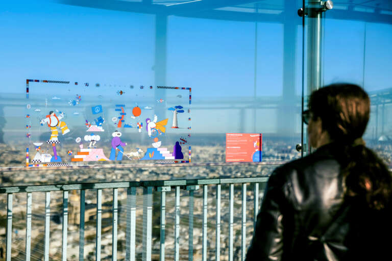 We imagined the PANORAMART exhibition with artist Aurélien Jeanney (Maison Tangible), transforming the observatory’s glass walls into a space for creative expression around possible futures for an entire year. Ten colourful trompe-l’œil murals blended imagination with the urban landscape, inviting visitors to discover a reimagined Paris from a precise vantage point.